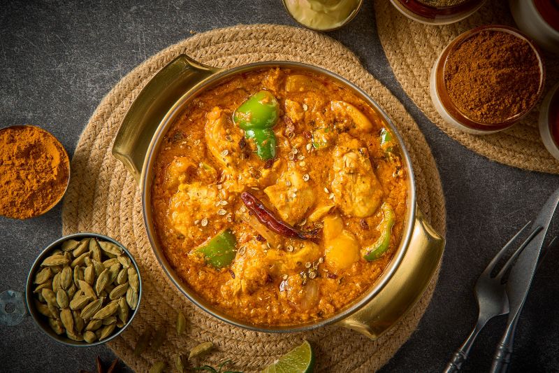 Chicken cubes cooked in onion tomato gravy